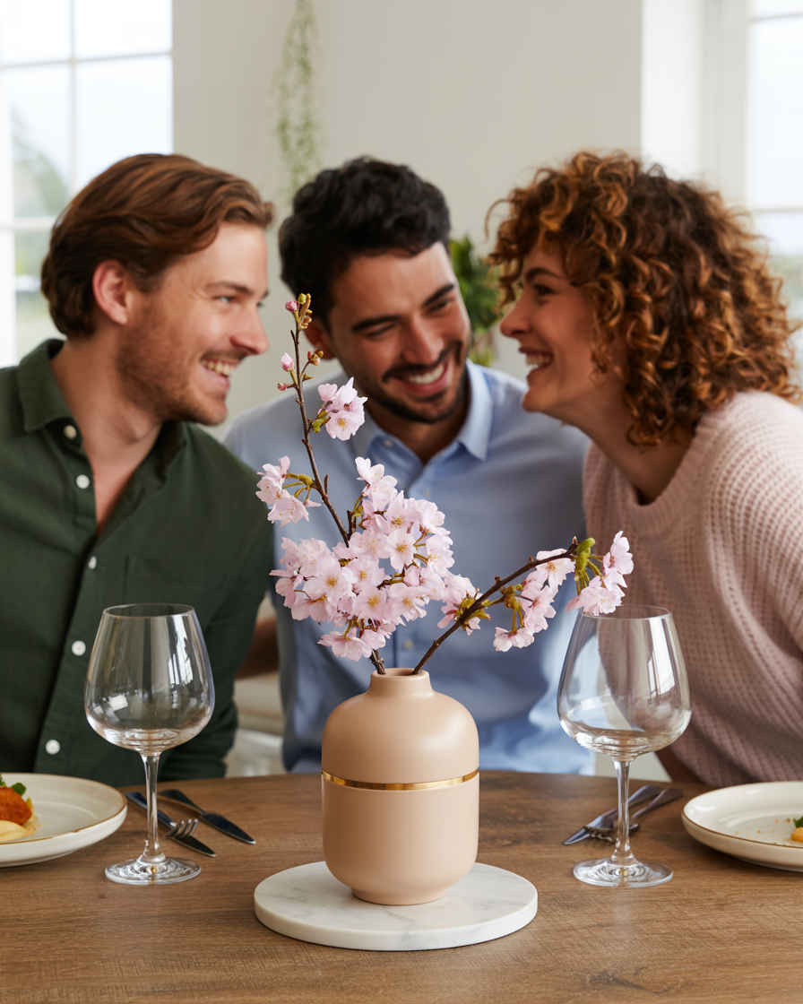 Soft Pink Cherry Blossom Arrangement in Gold-Banded Ceramic Vase
